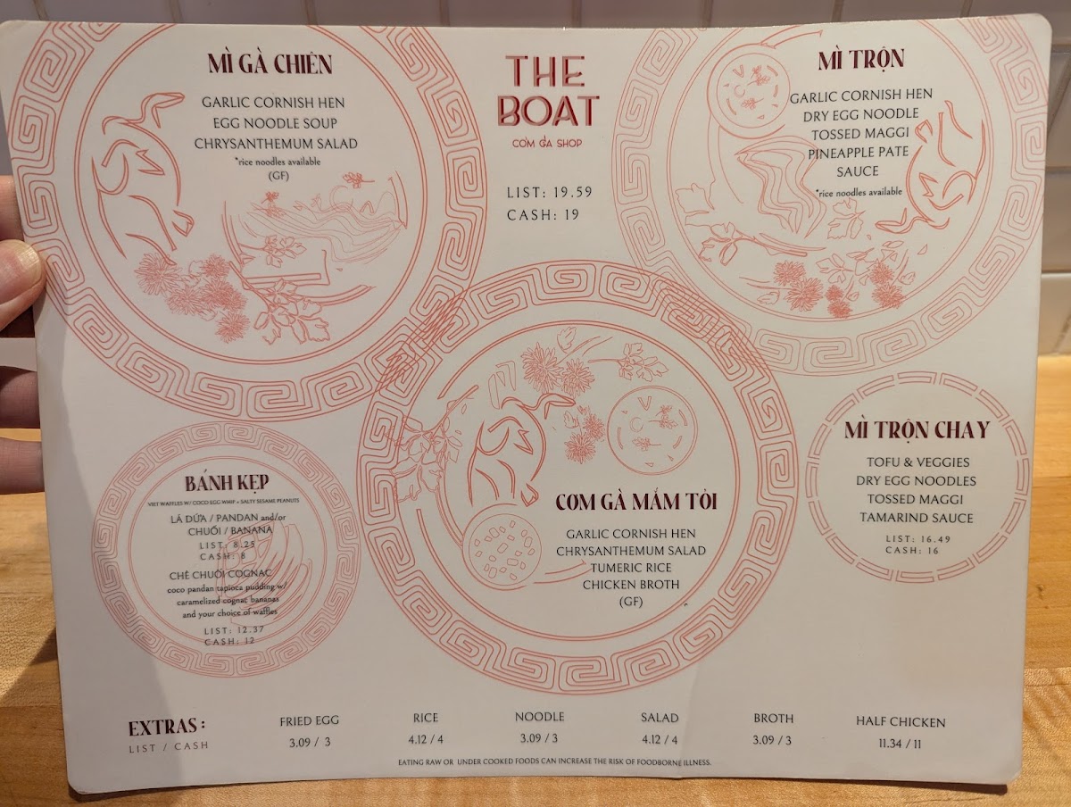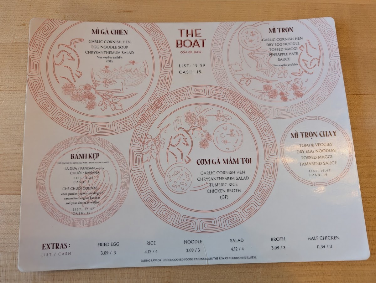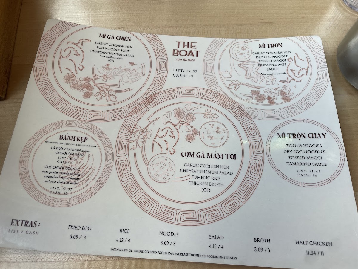 - Main Dishes: The menu highlights chicken-centered dishes including garlic fried chicken served with rice or egg noodles, as well as specialties like shrimp pho, pho nam, bun bo hue, and vermicelli bowls. There are also pandan waffles and unique offerings like MÌ Trôn and half chicken options.