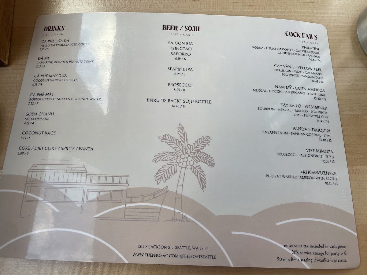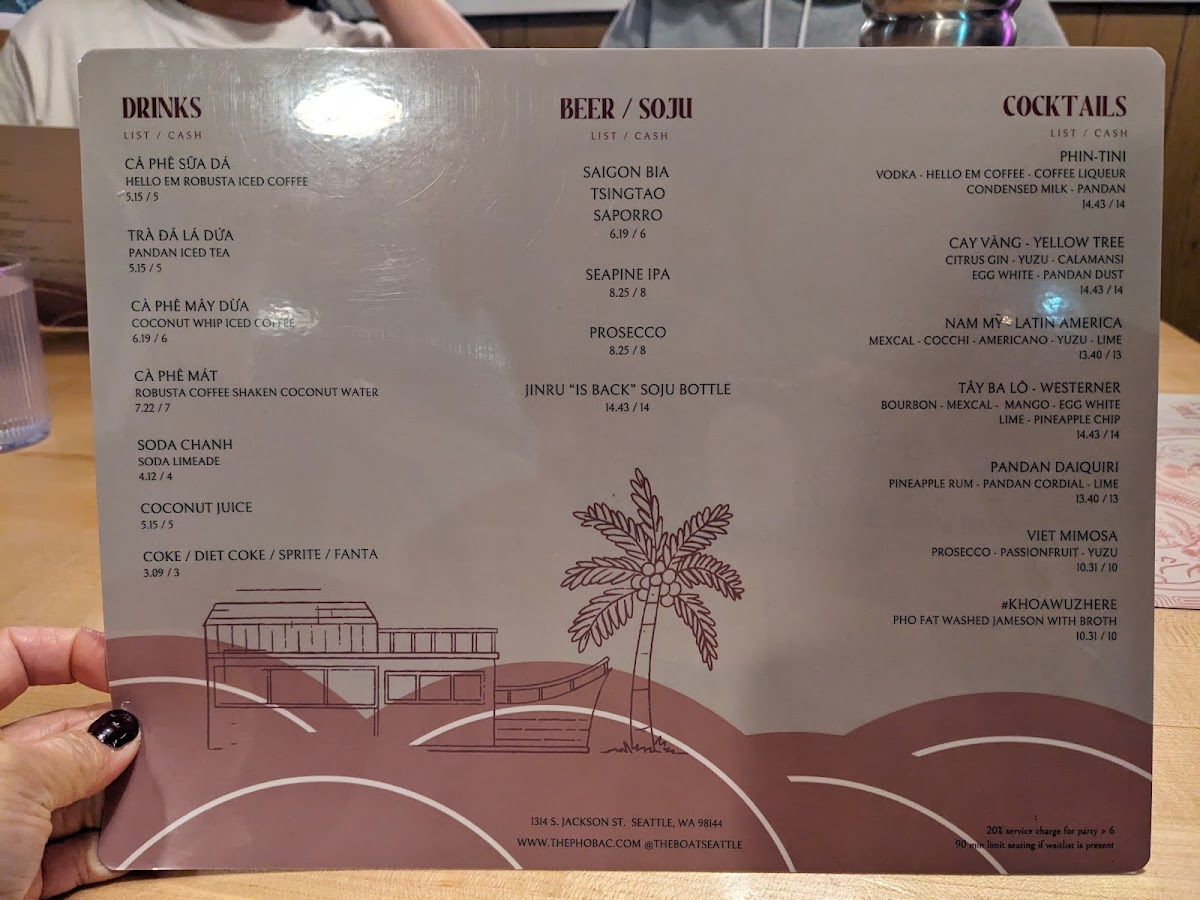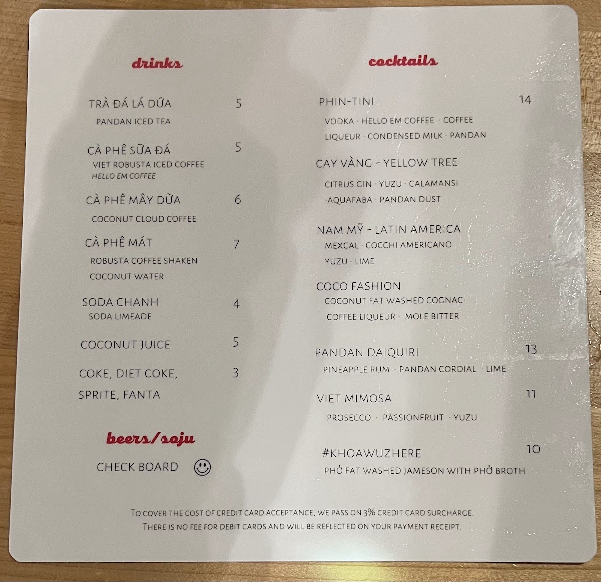 - Beverages: Includes a variety of hot and iced Vietnamese coffees such as Viet Robusta Iced Coffee, Vietnamese Iced Coffee, and Coconut Cloud Coffee, as well as pandan iced tea, pineapple pandan waffles, guava juice, and a green tea martini.